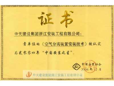 “空氣分離裝置安裝技術”榮獲2004年度“中國安裝之星”